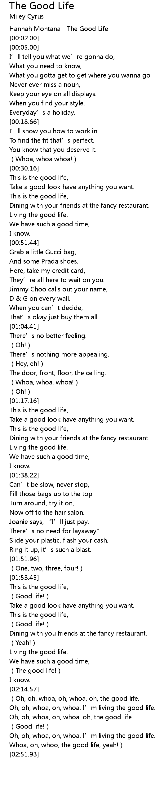 | [02:14.89] | (Oh, oh, whoa, oh, whoa, oh, the good life. |
