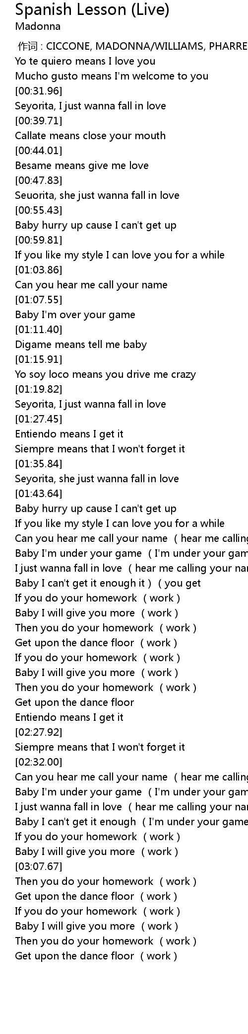 | [01:16.54] | Yo soy loco means you drive me crazy |