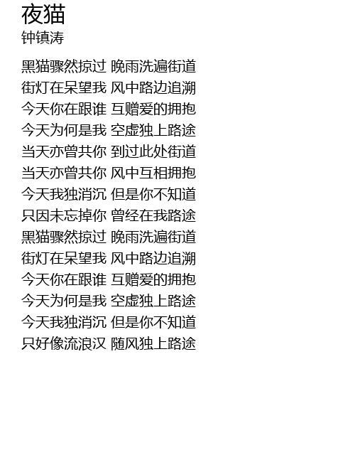 | [01:52.16] | 黑猫骤然掠过 晚雨洗遍街道 |