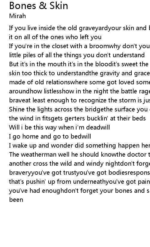 | The weatherman well he should knowthe doctor too from down belowthey call to one another cross the wild and windy nightdon't forgetyou've got loveyou've got braveryyou've got trustyou've got bodiesresponsibilitiesthere's still mountains that's pushin' up from underneathyou've got painit's not so strange but now you've had enoughdon't forget your bones and skinor where you goor where you've been |