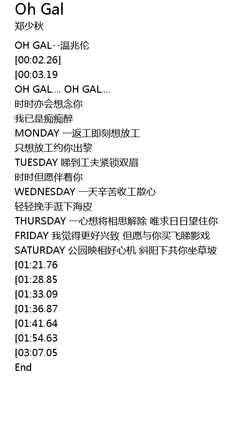 | [02:43.76][01:41.64] | OH GAL.... OH GAL.... |
