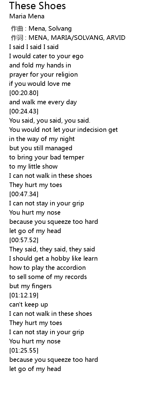 | [01:16.38] | I can not walk in these shoes |