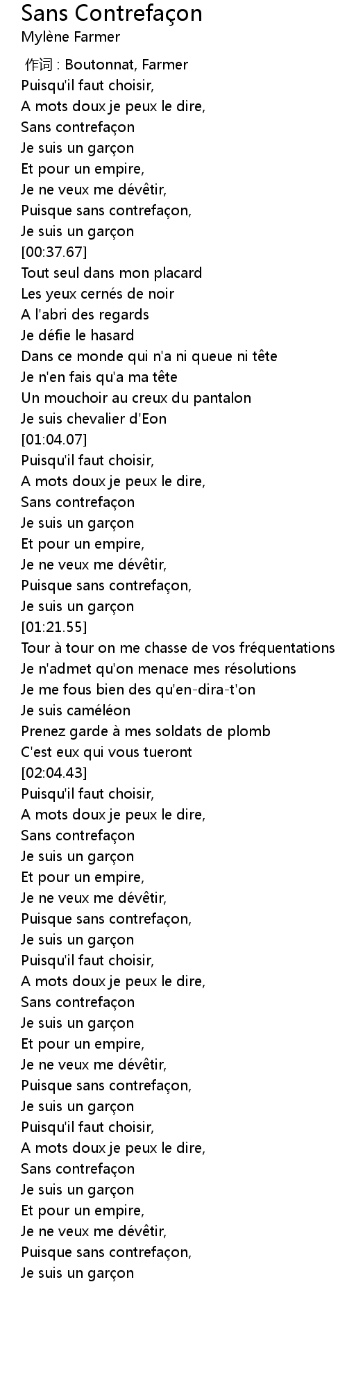 | [02:12.33] | Sans contrefa on |