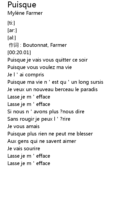 | [00:00.000] | zuo ci : Boutonnat, Farmer |