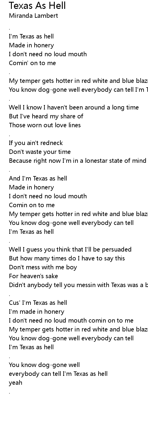 You know dog-gone well everybody can tell I'm Texas as hell |