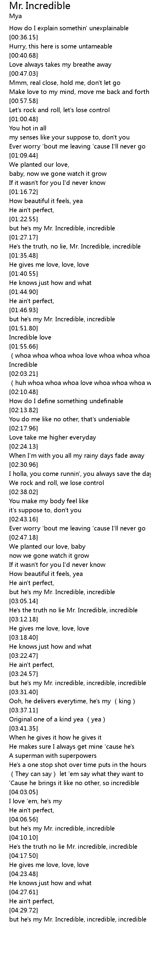 | [04:07.17] | but he's my Mr. incredible, incredible |