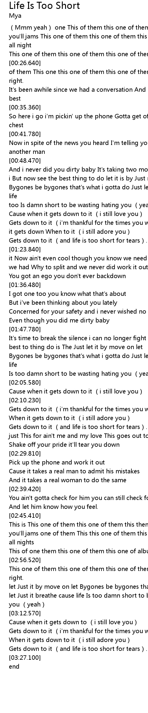| [01:05.590] | too Is damn short to be wasting hating you yeah |