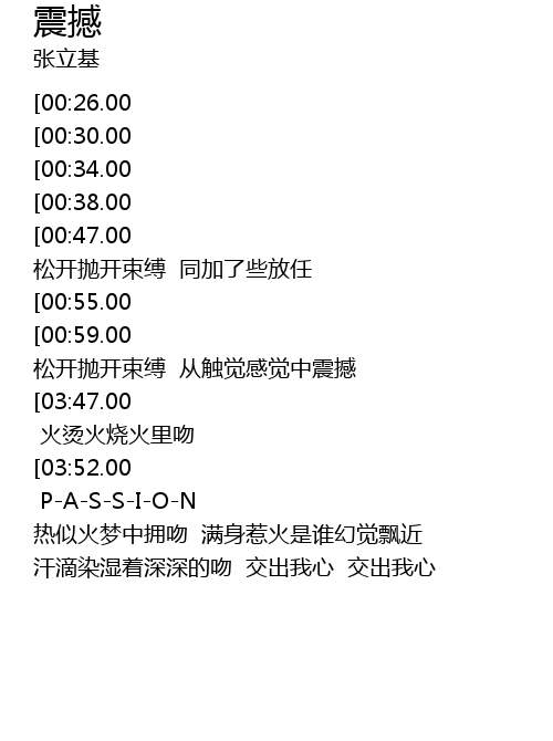 | [03:56.00][03:47.00][03:31.00][03:14.00][03:05.00][02:07.00][01:58.00][01:04.00] | P-A-S-S-I-O-N 火烫火烧火里吻 |