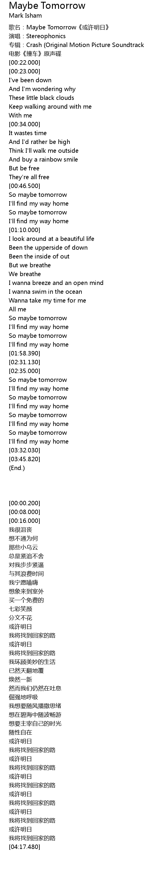| [00:00.200] | 歌名:Maybe Tomorrow《或许明日》 |