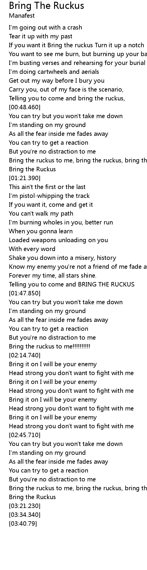 | [01:10.880] | Bring the ruckus to me, bring the ruckus, bring the ruckus to me |