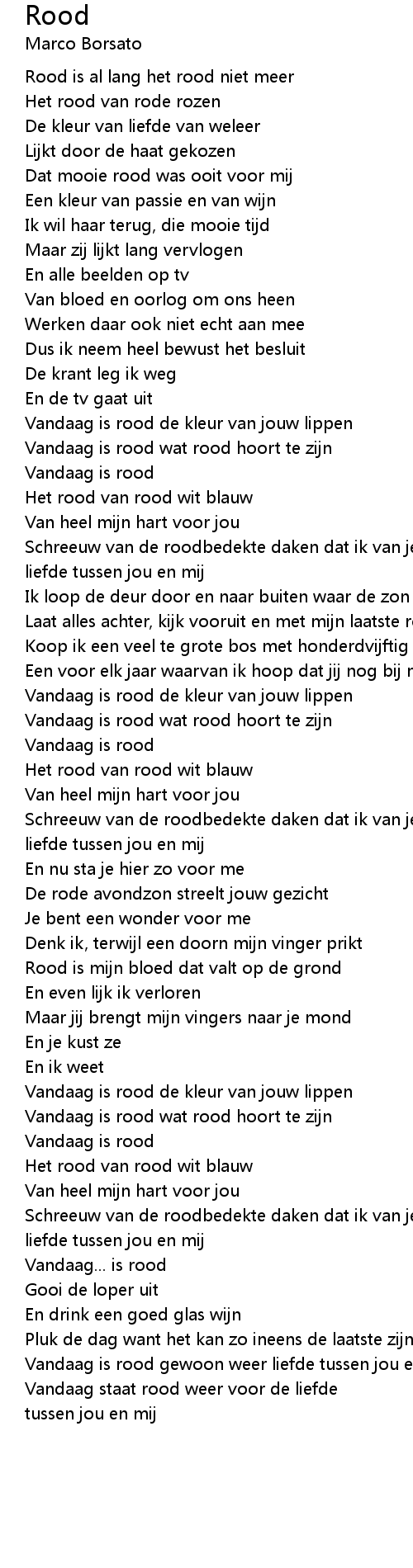 Schreeuw van de roodbedekte daken dat ik van je hou Vandaag is rood gewoon weer liefde tussen jou en mij |