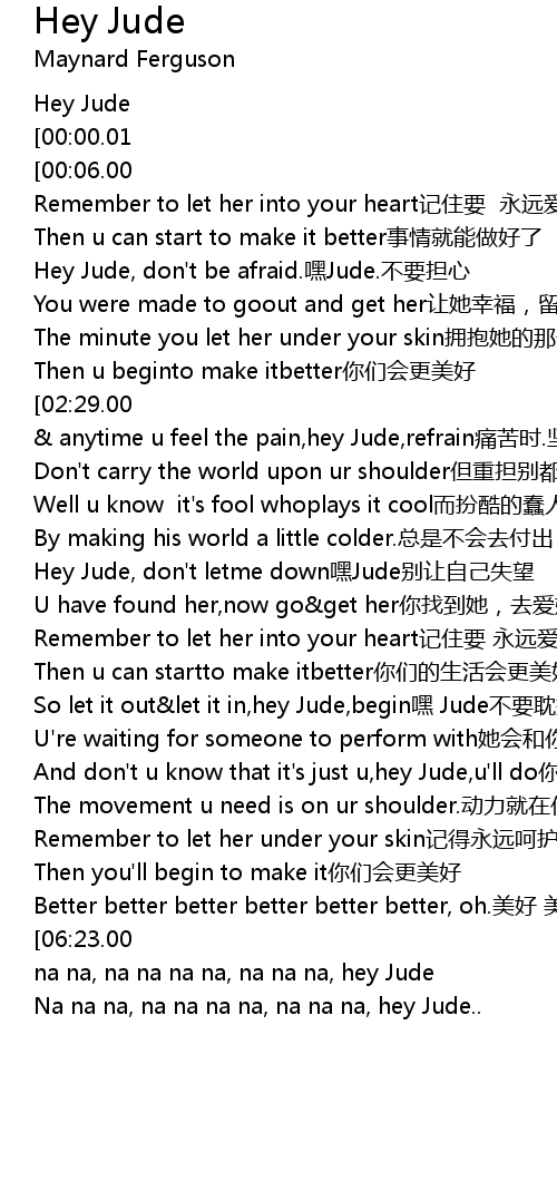 | [02:38.00][00:00.01] | Hey Jude, don' t make it bad. hēi Jude, bú yào jǔ sàng |