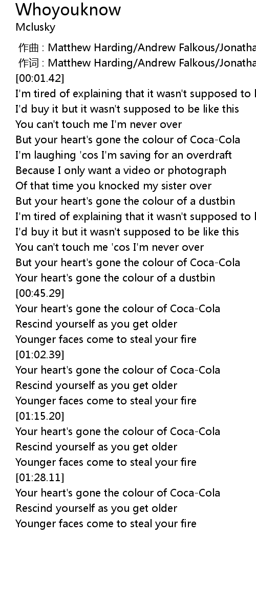 | [00:52.32] | Your heart's gone the colour of Coca-Cola |