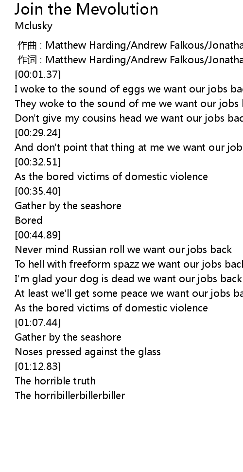 | [00:19.59] | I woke to the sound of eggs we want our jobs back |