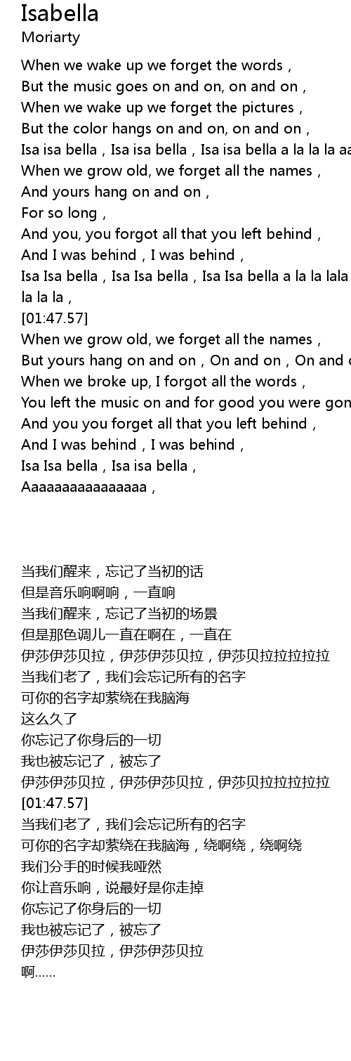 | [00:40.29] | 伊莎伊莎贝拉,伊莎伊莎贝拉,伊莎贝拉拉拉拉拉 |