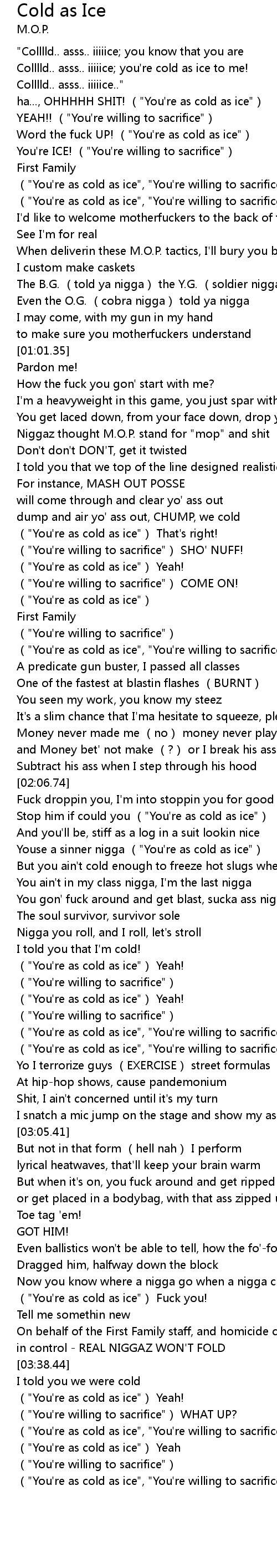 | [00:23.22] | Word the fuck UP! ("You're as cold as ice") |