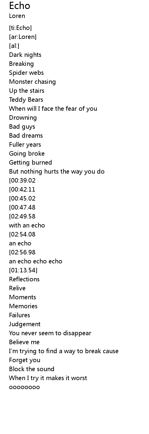 | [03:05.98][02:54.08][02:17.94][02:05.95][01:05.97][00:54.08] | Still in love with an echo |