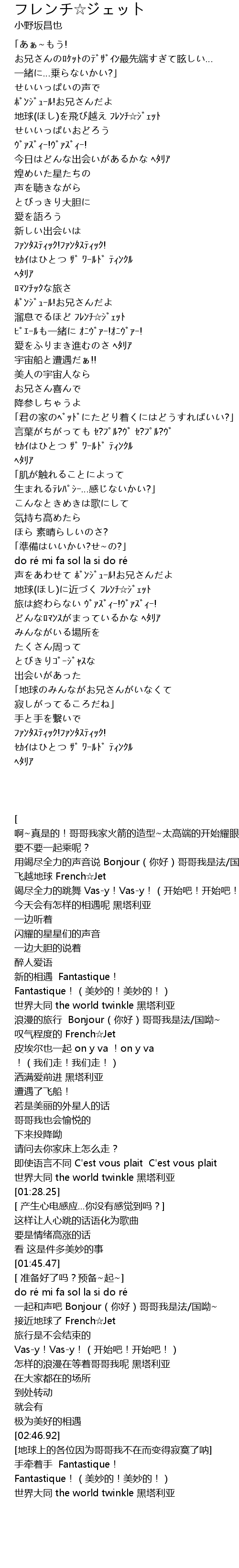 | [02:23.67] | 地球(ほし)に近づく フレンチ☆ジェット |