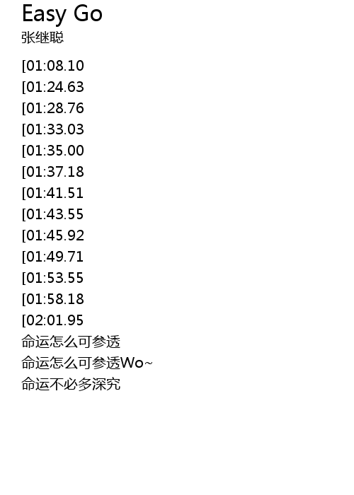 | [00:17.00][01:08.10][02:08.57][02:40.88] | 张继聪-EASY GO(粤) |