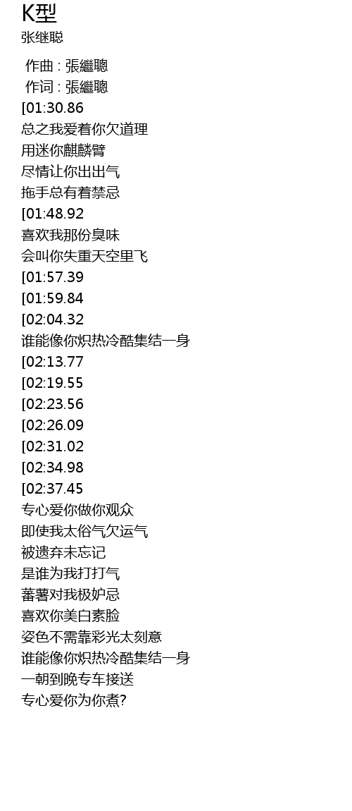 | [00:19.00][01:30.86][02:43.73][03:21.69] | 张继聪-K型(粤) |