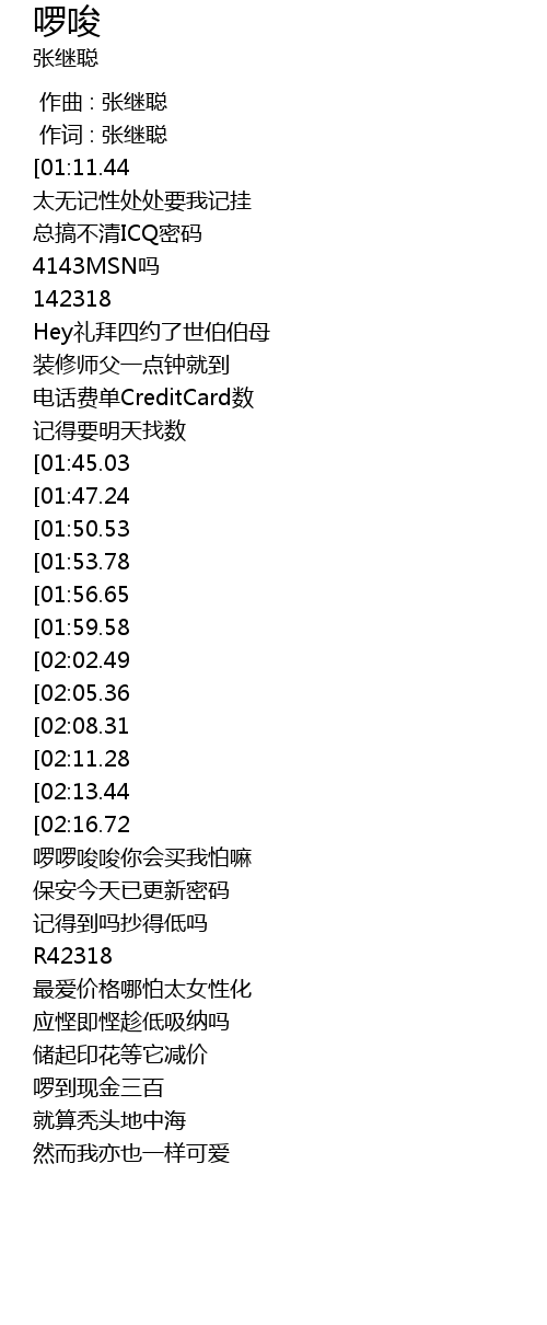 | [00:08.00][01:11.44][02:21.57][03:08.21] | 张继聪-啰唆(粤) |