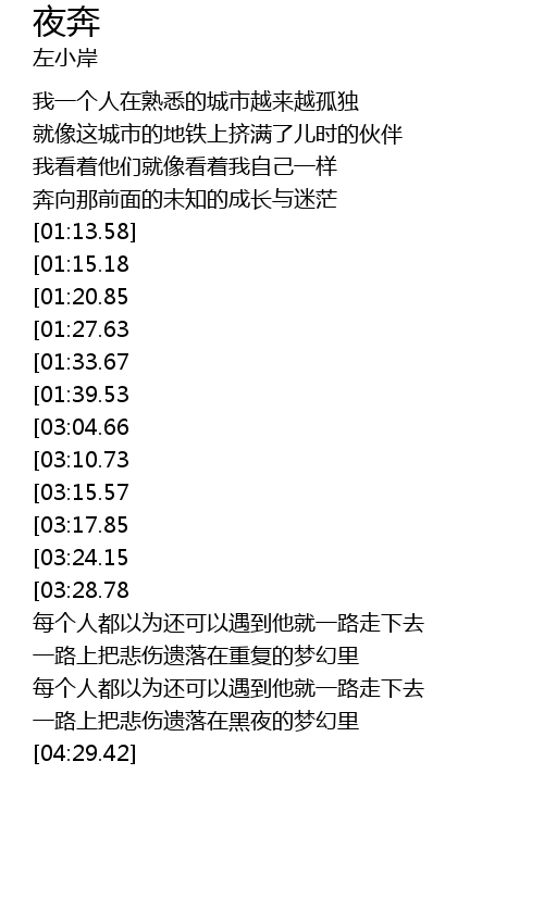 | [02:38.11][01:15.18] | 我一个人走出门走在这冰冷的夜路上 |