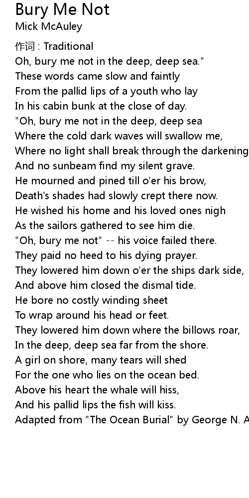| "Oh, bury me not in the deep, deep sea | |