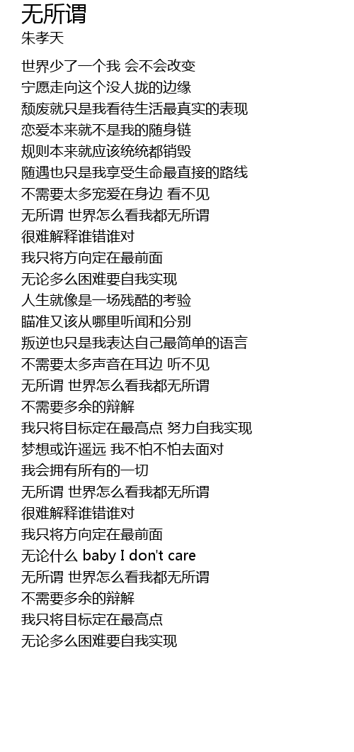 | [03:16.52] | wú suǒ wèi shì jiè zěn me kàn wǒ dōu wú suǒ wèi |