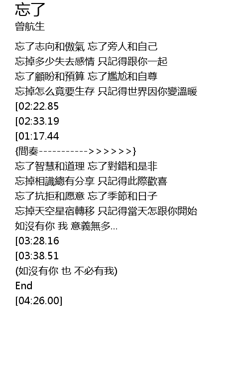 | [01:54.31] | 忘掉相識總有分享 只記得此際歡喜 |