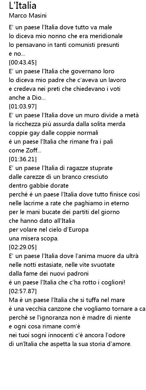| [02:49.02] | e un paese l' Italia che c' ha rotto i coglioni! |