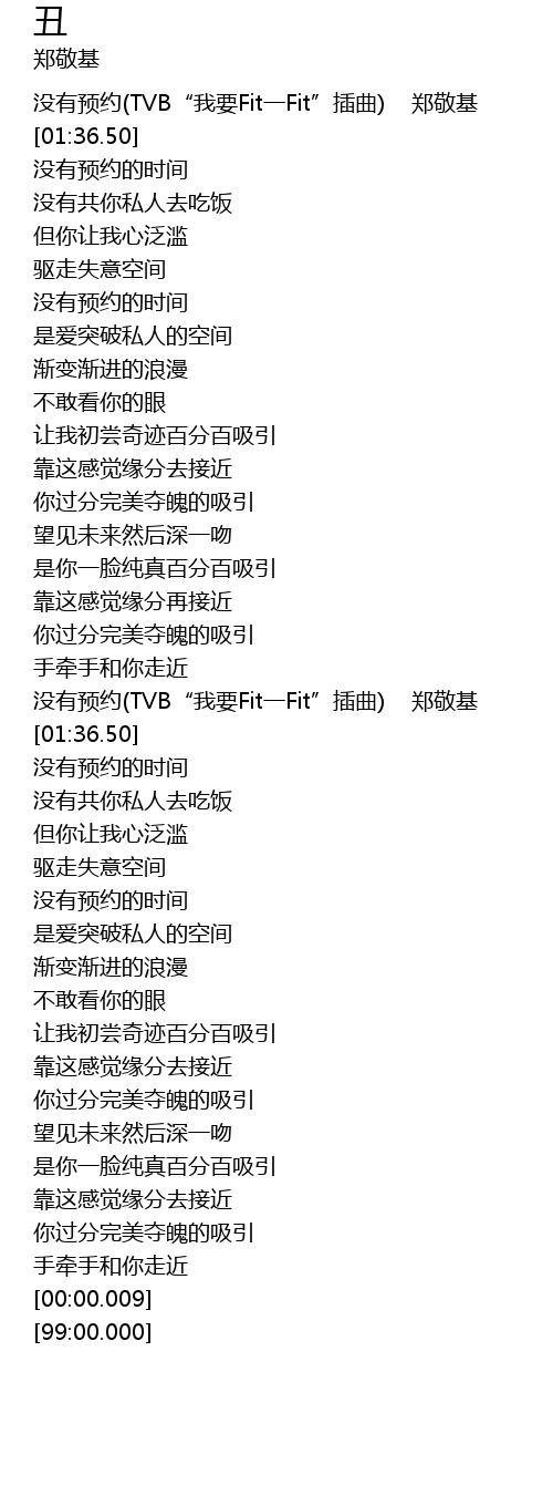 | [01:20.50] | 没有预约(TVB“我要Fit一Fit”插曲) 郑敬基 |