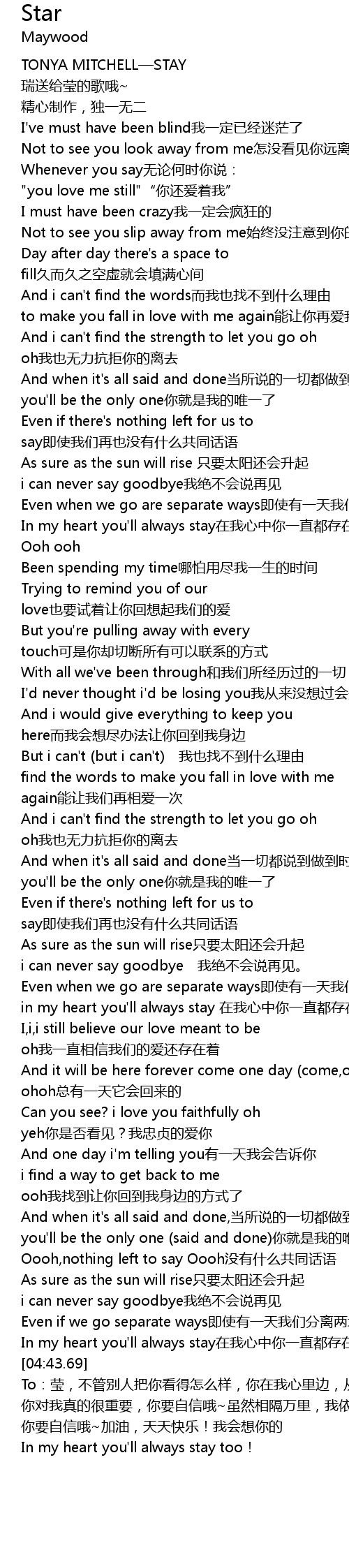 | [03:24.80] | in my heart you'll always stay 在我心中你一直都存在着 |