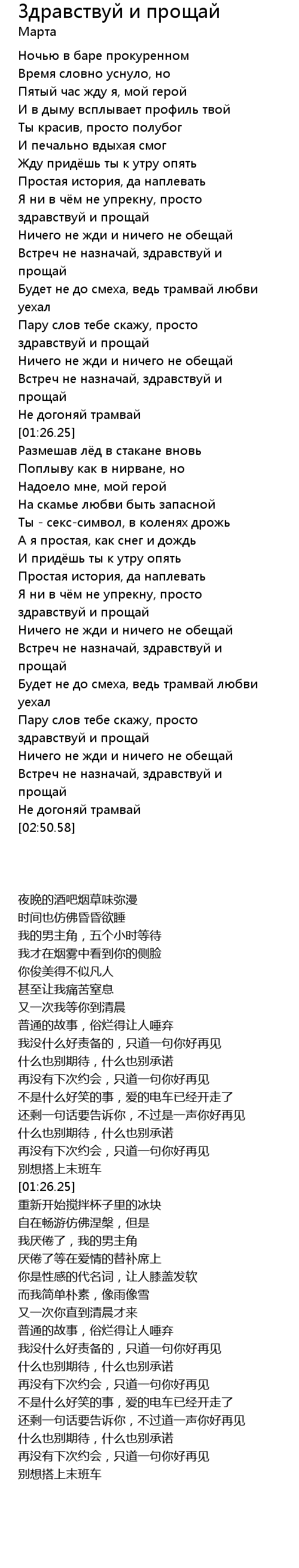 | [01:10.40] | Пару слов тебе скажу, просто здравствуй и прощай |
