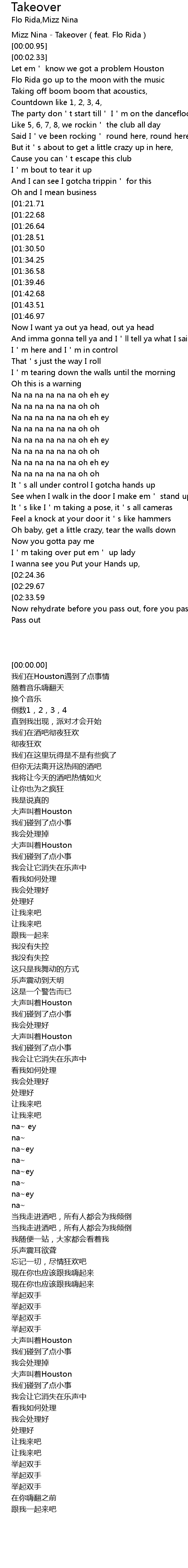 | [00:00.00] | Mizz Nina - Takeover(feat. Flo Rida) |