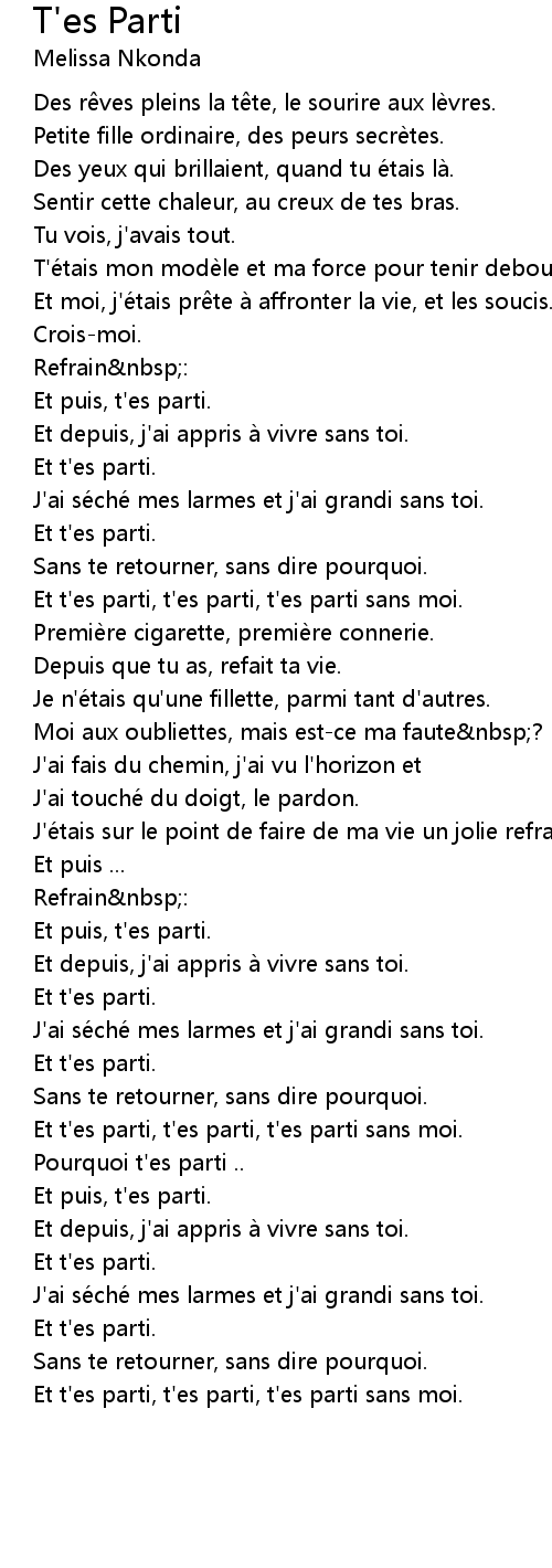 | Et t'es parti, t'es parti, t'es parti sans moi. | |