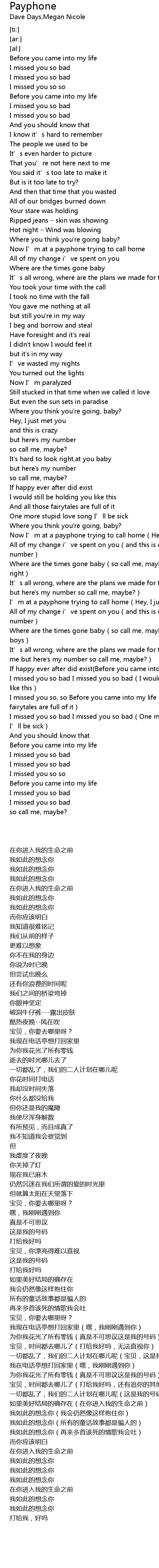| [02:16.38] | Now I' m at a payphone trying to call home Hey, I just met you |