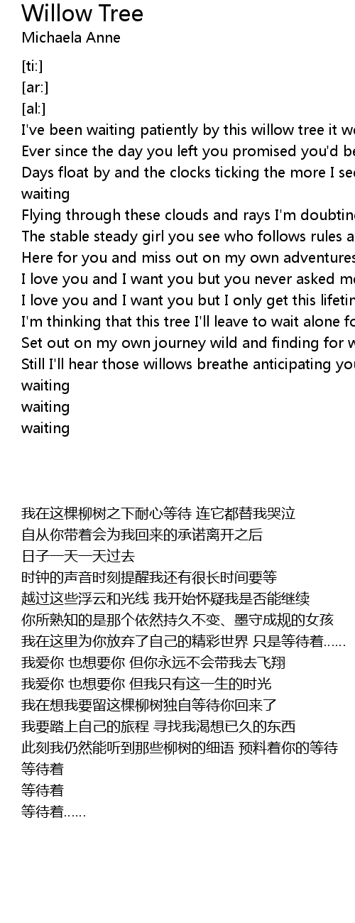 Still I'll hear those willows breathe anticipating you to be waiting |