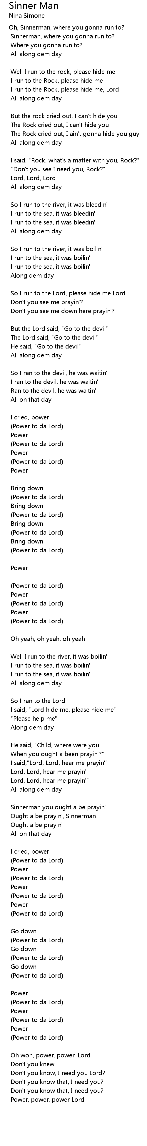 Sinnerman you ought a be prayin' |