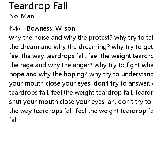 | why the noise and why the protest? why try to talk when it' s all been said? why the dream and why the dreaming? why try to get away when there' s no place ahead? feel the way teardrops fall. feel the weight teardrop fall. teardrop fall. why the rage and why the anger? why try to fight when you' ve got no defense? why the hope and why the hoping? why try to understand when it never made sense? shut your mouth close your eyes. don' t try to answer, don' t try to try. feel the way teardrops fall. feel the weight teardrop fall. teardrop fall. teardrop fall. shut your mouth close your eyes. ah, don' t try to answer, don' t try to try. feel the way teardrops fall. feel the weight teardrop fall. teardrop fall. teardrop fall. |