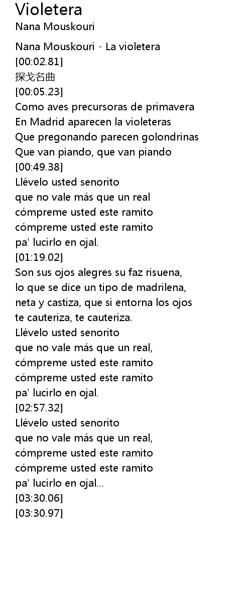 | [00:22.53] | En Madrid aparecen la violeteras |