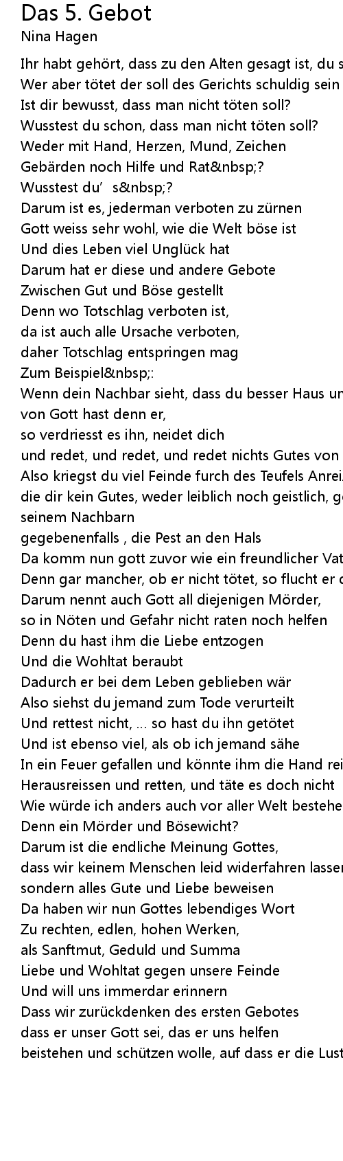 | Ihr habt gehört, dass zu den Alten gesagt ist, du sollst nicht töten ! - Wer aber tötet der soll des Gerichts schuldig sein | |