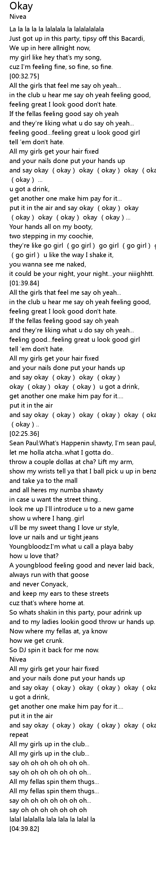 | [01:00.75] | and say okay (okay) okay (okay) okay (okay) okay (okay) ... |