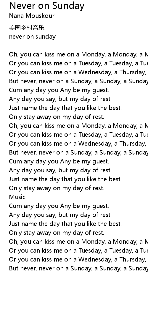 | But never, never on a Sunday, a Sunday, a Sunday, cause that' s my day of rest. | |
