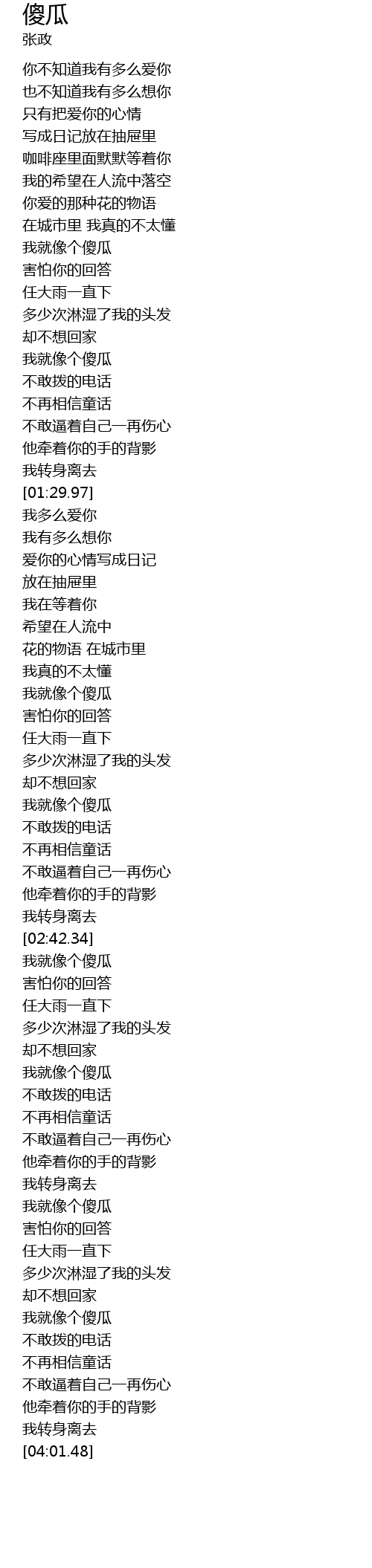 | [00:55.39] | wǒ jiù xiàng gè shǎ guā |