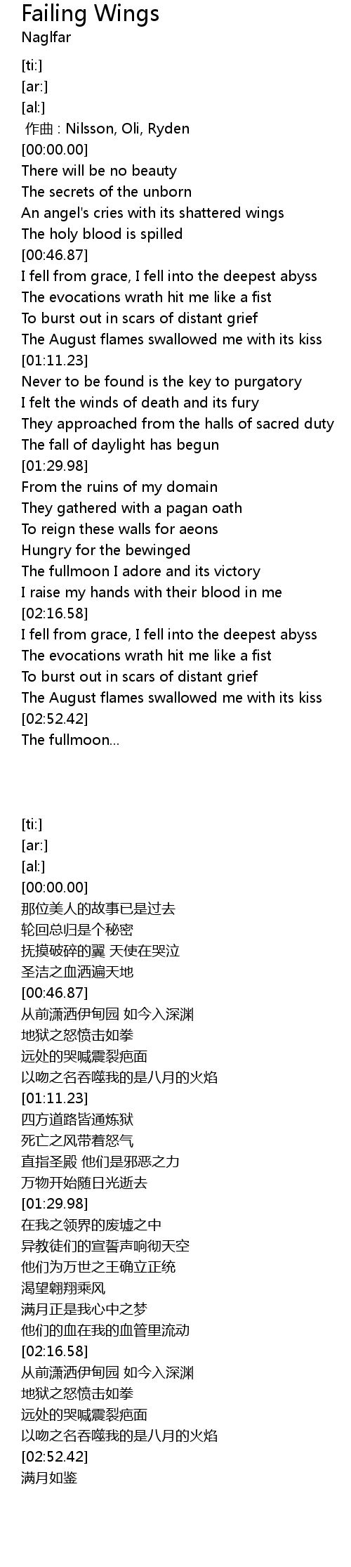 | [00:41.28] | An angel' s cries with its shattered wings |