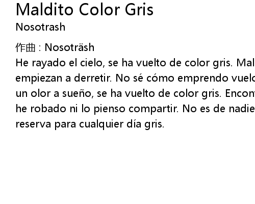 | He rayado el cielo, se ha vuelto de color gris. Malditos cubos de hielo, se empiezan a derretir. No sé có mo emprendo vuelo, viajaré cerca de ti. Só lo es un olor a sue o, se ha vuelto de color gris. Encontré un momento feliz, no lo he robado ni lo pienso compartir. No es de nadie, tan só lo para mí. Es mi reserva para cualquier dí a gris. |