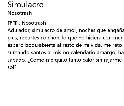 | Adulador, simulacro de amor, noches que enga an al dí a y despué s, mezclas los pies, repartes colchó n, lo que no hiciera con menos calor Ay amor!, ... y espero boquiabierta al resto de mi vida, me reto cada dí a a ser casi la misma, sumando santos al mismo calendario amargo, haciendo cí rculos en rojo algú n sá bado. Có mo me quito tanto calor sin rajarme la piel, sin estar lejos del sol? |