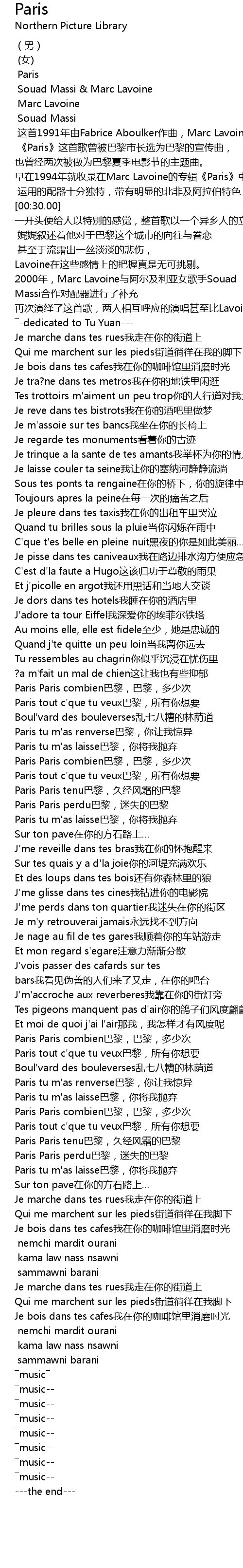 | [00:20.00] | 早在1994年就收录在Marc Lavoine的专辑《Paris》中 |