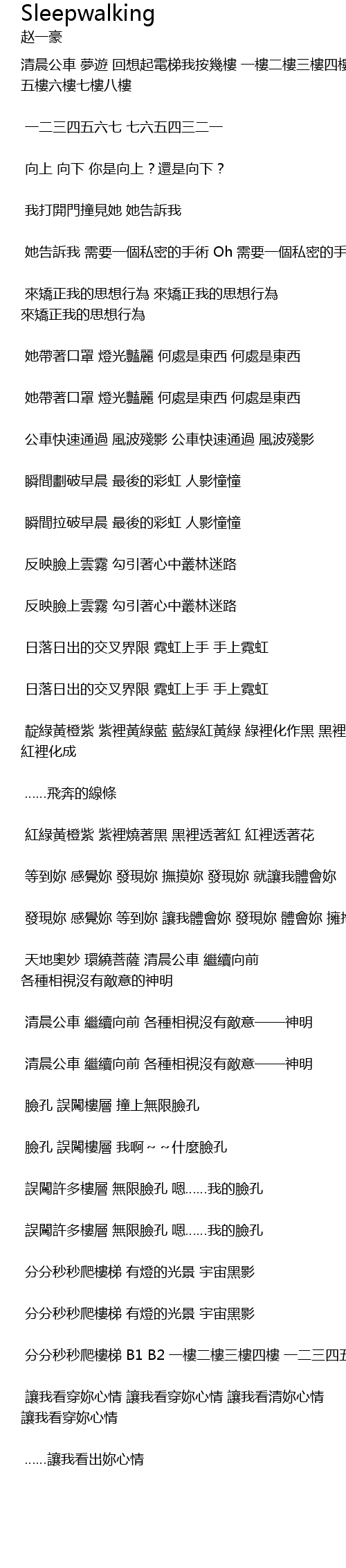 | 清晨公車 夢遊 回想起電梯我按幾樓 一樓二樓三樓四樓 五樓六樓七樓八樓 | |