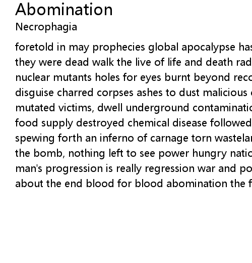 foretold in may prophecies global apocalypse has arrived those who lived, wish they were dead walk the live of life and death radiation that covers the skies nuclear mutants holes for eyes burnt beyond recognition melted flesh nature's disguise charred corpses ashes to dust malicious cries of unrelenting lust mutated victims, dwell underground contamination leads to starvation water and food supply destroyed chemical disease followed by diabolical unleashment spewing forth an inferno of carnage torn wasteland of rubbish and debris after the bomb, nothing left to see power hungry nations technology and science prove man's progression is really regression war and political violence have brought about the end blood for blood abomination the final godsend